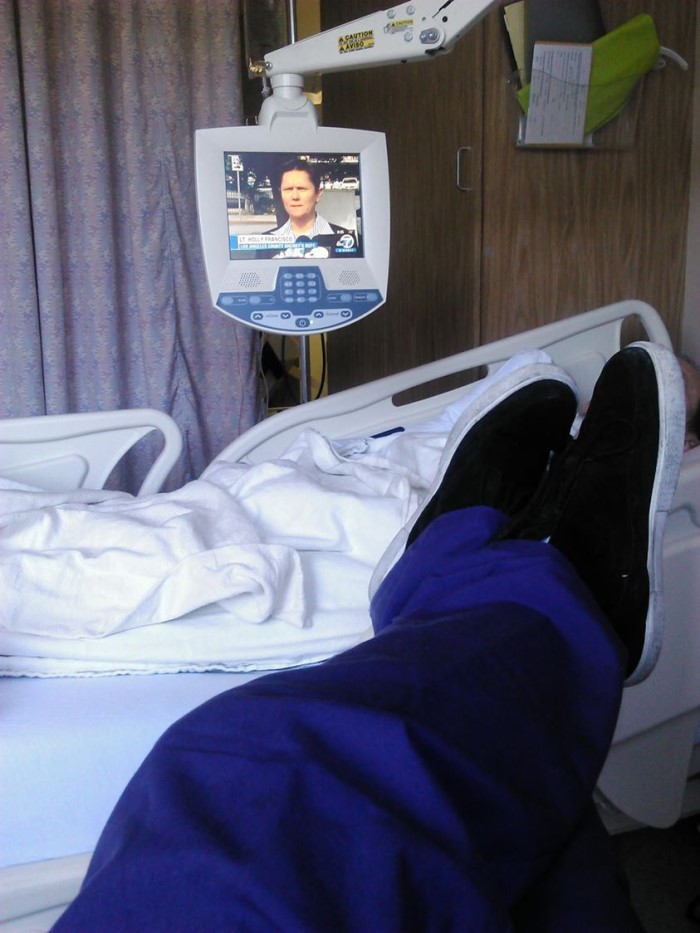 with feet up (b's Up) on a Tustin hospital bed all day for 16 hours!