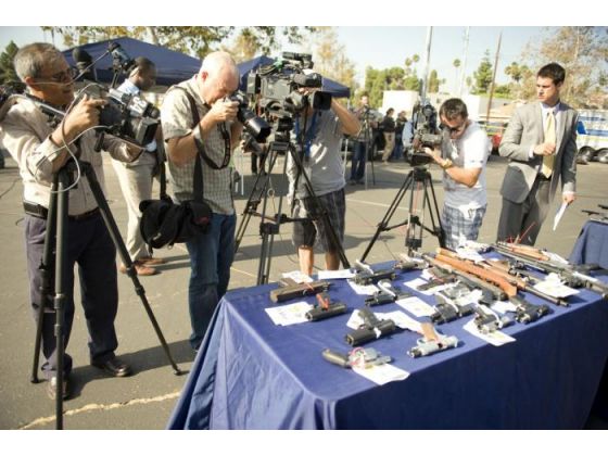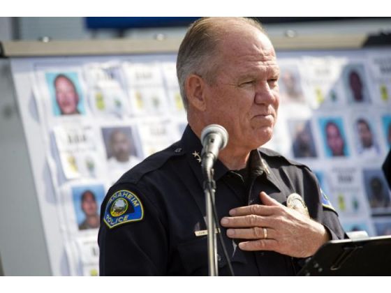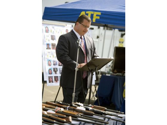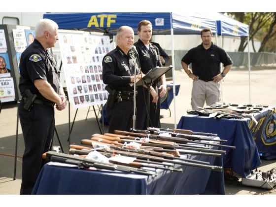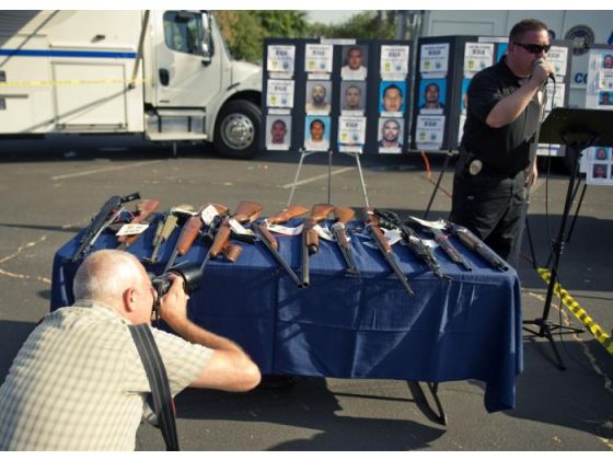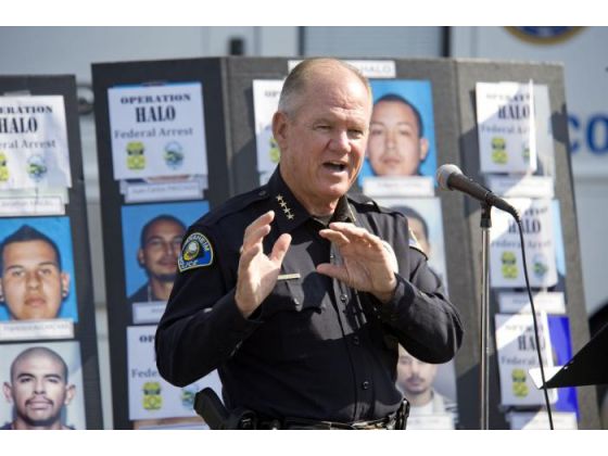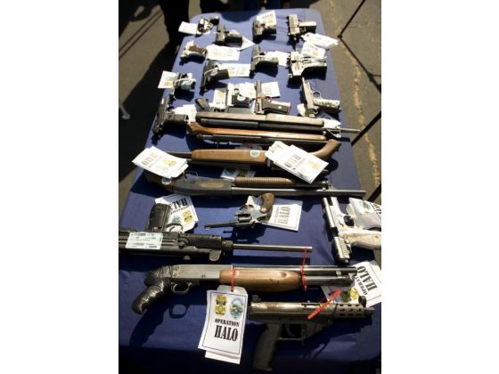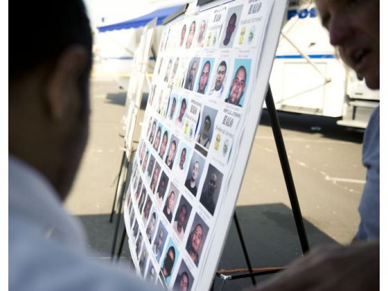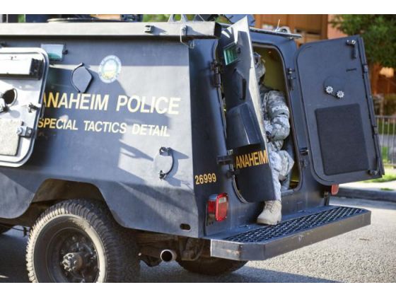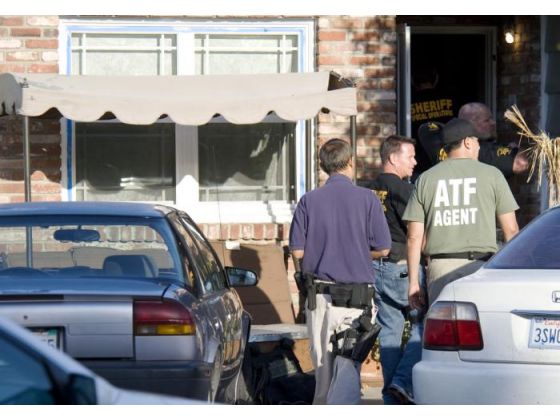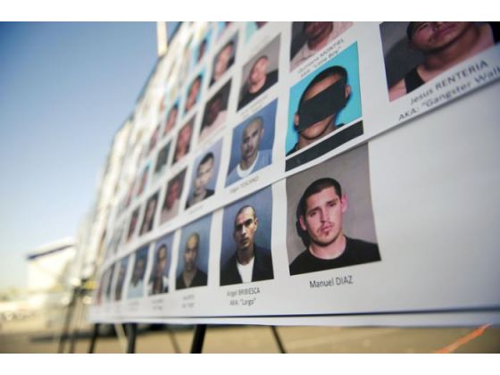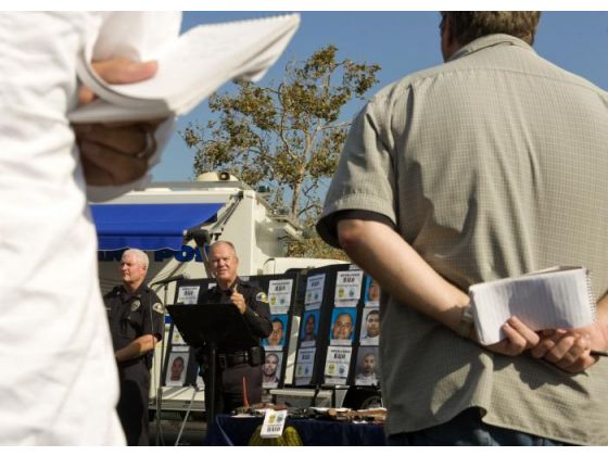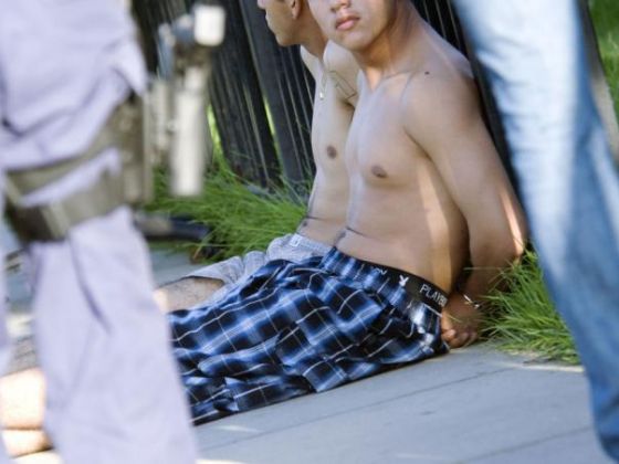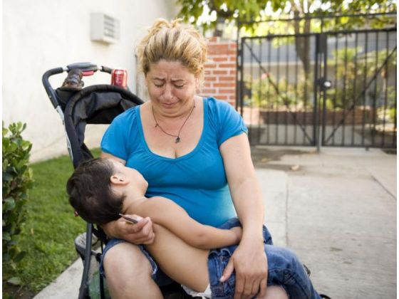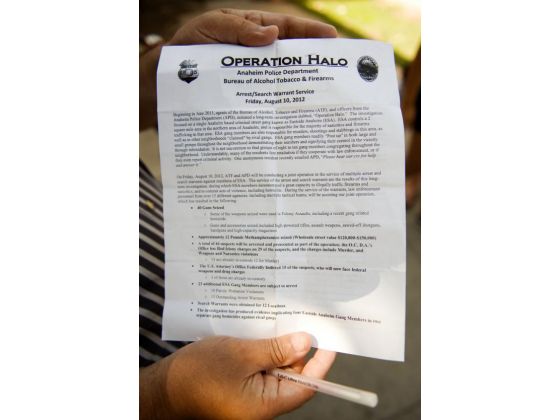 ![]() Benmore Lane neighborhood resident Elvia Navarro pushes back tears as she holds her sleeping son Federico Gonzalez, 1, when talking about her son Victor Alfonso Gonzalez, who was arrested in this morning's Operation Halo crackdown in Anaheim. |
